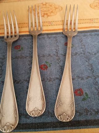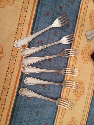 Juego de seis tenedores antiguos de alpaca. Son piezas elegantes y de aspecto lustroso. - Ideales para uso diario o colección. - Se aprecian detalles decorativos en el mango. - Perfectos para añadir un toque clásico a tu mesa.