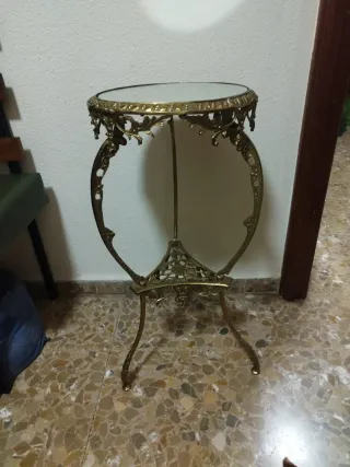 Mesa auxiliar antigua de bronce y cristal