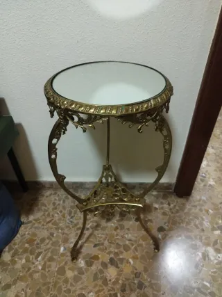 Elegante mesa auxiliar con un diseño clásico y ornamentado. - Estructura principal de bronce con detalles decorativos. - Superficie redonda de cristal. - Patas curvas con remates dorados. Necesitaría una limpieza, pero está en buen estado