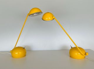 Pareja de Lámparas de Mesa de Diseño Posmoderno Caracterizadas por una base semiesférica sólida у un brazo estilizado que sostiene un cabezal semiesférico a juego en metal lacado en color amarillo. Funcionalidad: El cabezal y el brazo es orientable, permitiendo proyectar luz directa para lectura o luz ambiental indirecta según la posición. Conservan el brillo original del lacado y estan en buen estado vintage y de funcionamiento. Altura aproximada 32 cm Metalarte, lupela, fase, antiguo, arquitecto, lampada, artemide, lámpara, flexo, aplique, iluminación, kartell, tramo, lamparita,, vintage, de Targetti, lamsar, industrial, flos