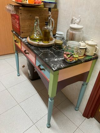 mesa de madera ! barnizada . marmol negro ( no esta lijado recto x detras ). pomos art deco. mesa antigua