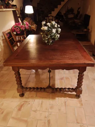 Impresionante mesa de comedor de roble macizo de principios de 1900, extensible, con un diseño clásico y robusto. Sus patas torneadas le dan un toque distintivo y sofisticado. Medidas 180cm Largo cerrada y 360cm de Largo extendida Ancho 130cm Alto 77 cm - Fabricada en madera de roble macizo. - Diseño con patas torneadas. - Acabado en tono marrón cálido.