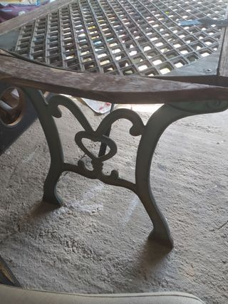 Preciosa mesa de coser antigua, ideal para darle un toque vintage a tu hogar. Se encuentra en buen estado y lista para usar. - Superficie de mármol. - Estructura de metal resistente. - Dos sillas incluidas. Se regalan las 2 sillas
