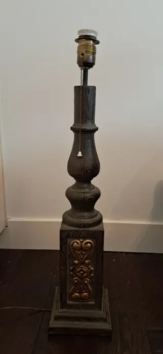 Elegante base de lámpara de mesa con unas cuantas décadas de antiguedad, con un diseño clásico y detalles ornamentales. Necesita un enchufe nuevo. - Base cuadrada con detalles dorados. - Cuerpo torneado con acabado imitación madera. - Cadena para encendido y apagado.