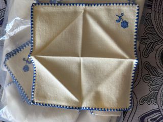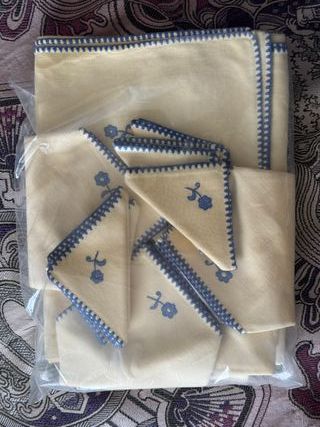 Mantel y servilletas de hilo bordado azul