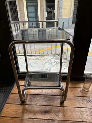 Elegante carrito auxiliar con superficie de cristal y estructura metálica. - Bandeja inferior negra. - Ruedas para fácil movilidad. - Diseño moderno y funcional.