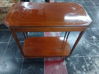 Elegante mesa auxiliar con un diseño octogonal y dos niveles. Perfecta para añadir un toque clásico a tu hogar. - Patas torneadas con ruedas - Bandeja inferior. - Tiene algunos daños como se puede apreciar en la imagen
