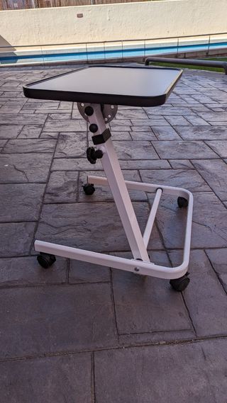 Mesa auxiliar con ruedas, ideal para usar sobre la cama o el sofá. Su diseño permite ajustarla a diferentes alturas. -Altura 85cm, tabla 70x40 - Tablero de madera. - Estructura de metal y plástico. - Ruedas para fácil movilidad. La mesa tiene cierta inclinación que no se aprecia en la foto. De ahí su bajo precio. 😉
