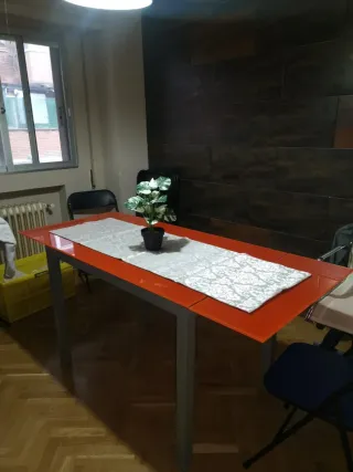 Mesa de comedor o auxiliar con superficie de cristal. - Patas metálicas plegables para fácil almacenamiento. - Diseño moderno y funcional.