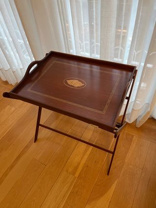 Antigua mesita auxiliar de madera con un diseño único. - Patas plegables para fácil almacenamiento. - Asas laterales para transportarla cómodamente.