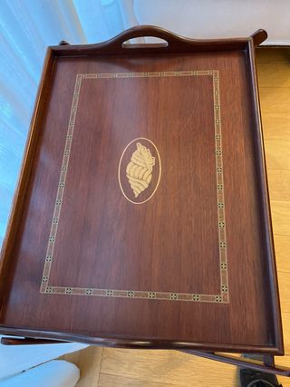 Práctica mesita auxiliar de madera, perfecta para tener a mano lo que necesites. Su diseño plegable la hace muy fácil de guardar. - Bandeja con asas. - Detalles decorativos en la superficie. - Estructura con patas plegables.