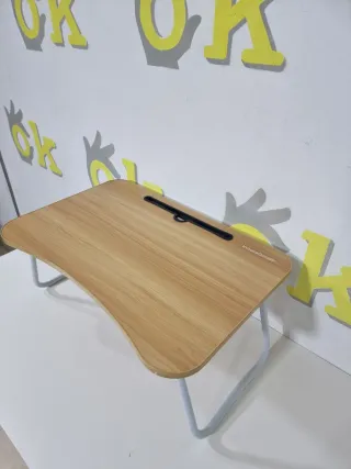 Mesa auxiliar portátil con un diseño práctico y funcional. Ideal para usar con tu ordenador o como superficie adicional. - Superficie de madera con acabado natural. - Bordes de plástico blanco. - Mecanismo de plegado para fácil almacenamiento.