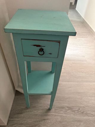 Mesita auxiliar de estilo vintage, perfecta como mesita de teléfono o auxiliar. - Diseño antiguo y elegante. - Un cajón con tirador decorativo. - Dos baldas para almacenamiento adicional. - Patas laterales con detalles torneados. Medidas: - Alto 65cm - Ancho 30cm - Profundo 23cm - Cajón altura 6cm ⭐⭐⭐⭐⭐ Puedes ver en mi perfil que he hecho ya 130 ventas y tengo todo muy buenas opiniones
