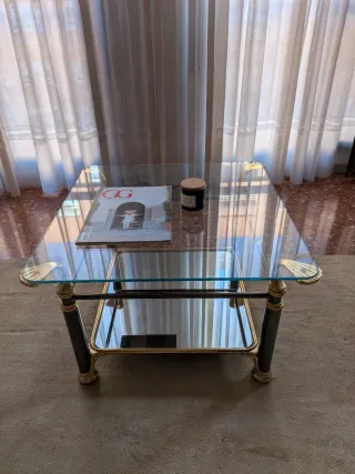 Elegante mesa auxiliar de estilo vintage y retro. Su diseño combina a la perfección la transparencia del cristal con el brillo del metal dorado. - Tablero superior de cristal. - Estructura con detalles dorados. - Segundo nivel con superficie espejada. - 65 Ancho x 65 Profundo x 45 Alto