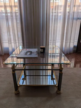 Elegante mesa auxiliar de estilo vintage con estructura metálica dorada y superficie de cristal. Estructura de metal con medidas aproximadas de la mesa: 113 centímetros de largo, 58 centímetros de ancho y 44 centímetros de alto. La estructura de metal se puede apreciar algunos desperfectos del uso en las fotos, pero cristales y estructura en perfecto estado. - Diseño de dos niveles. - Patas ornamentadas. - Acabado brillante.