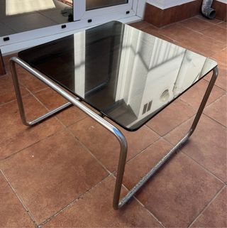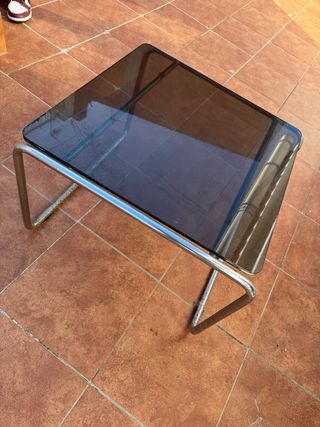 Elegante mesa auxiliar de diseño vintage. Su sobre de cristal ahumado y estructura tubular de metal le dan un toque moderno y sofisticado. - Sobresaliente diseño curvo en la base. - Encimera de cristal tintado. - Patas metálicas cromadas.