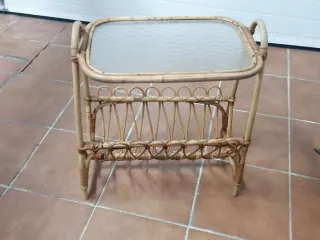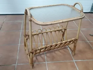 Encantadora mesita auxiliar de estilo vintage, elaborada con materiales naturales.Años 70-80. Le falta un trocito curvo de ratan - Estructura principal de bambú. - Superficie superior de cristal. - Incorpora un práctico revistero en la parte inferior.