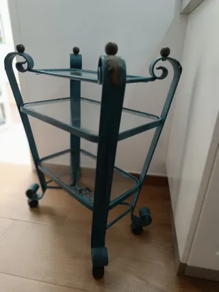 Elegante mesa auxiliar de forja con un diseño vintage. - Estructura de metal resistente. - Tres niveles con bandejas de cristal. - Ruedas para facilitar su movilidad. - Detalles decorativos en espiral y remates superiores.