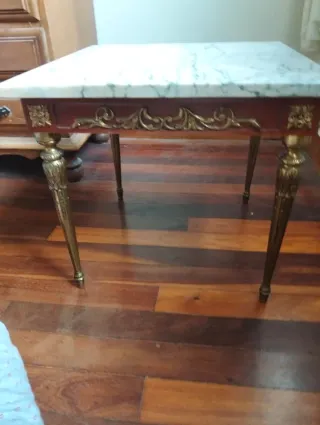 Elegante mesa auxiliar con un diseño clásico y ornamentado. - Tablero de mármol blanco con detalles. - Base y patas de metal con acabado dorado. - Adornos decorativos en el faldón. Recogida en Tomiño #vintage #mesa #marmol #metal