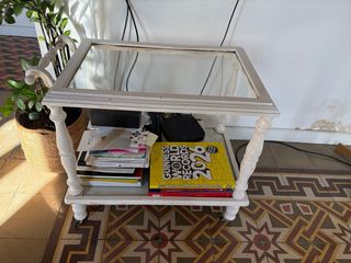 Mesa auxiliar vintage con un diseño elegante y funcional. Ideal para añadir un toque clásico a tu hogar. - Estructura de madera pintada en blanco. - Superficie de cristal. - Ruedas para facilitar su movilidad.