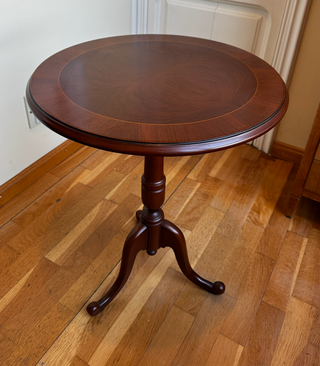 Elegante mesa auxiliar de madera maciza con base tipo pedestal y ruedas de latón. Diseño clásico muy decorativo. Ideal como mesa auxiliar de salón, mesa de rincón o mesa para lectura. Muy estable y en buen estado. Características: • Madera con acabado brillante • Base con patas curvas • Ruedas de latón originales • Estilo clásico elegante Perfecta para salón, despacho o decoración vintage. En venta por venta de piso