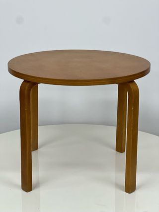 Mesa auxiliar redonda de diseño icónico inspirado en los modelos de Alvar Aalto. Las piezas de tornillería nos indica que se trata de una pieza de mediados del siglo XX. - Patas curvadas de madera. - Tablero circular. Instagram: @lluistore M114, Bobois, Muuto, Arflex, Arper, PuntMobles, BD, Fritz Hansen, B&B Italia, Moroso, Magis, diseño, disseny, vintage, retro, Midcentury, 705,80s, 90s, Pilma,Vinçon, Foscarini, Artemide, Flos, Marset,Vibia, Usm, Haller, Roset, Fase, Tramo, Metalarte, sillón, silla, sota, cadira