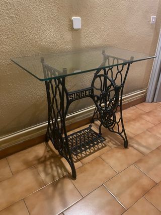 *SE ACEPTAN OFERTAS* Elegante mesa auxiliar con estructura de hierro fundido de Singer y tapa de cristal. - Diseño vintage. - Base de rejilla. - Ideal como mesa decorativa.