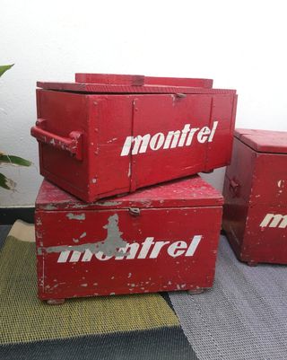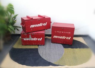 Antiguas cajas industriales de la empresa Española de Ingieneria Electrica Montrel fundada en 1963. Las cajas por el tipo de fabricacion pueden ser de sus inicios o incluso anteriores y reutilizadas. Se podrian usar como mesa auxiliar, mesa de centro, Baul... El precio que aparece en el anuncio es por las tres. Debido a su volumen y peso se envian separadas. Tambien se venden por separado. En la primera foto: Caja De Arriba : Largo 83. Alto 34cm.Ancho 40cm. PRECIO 150€ Caja De La Derecha (Compresor): Largo 63cm.Ancho 41cm. Altura 53cm. PRECIO 135€. Caja Izquierda: Largo 62cm. ancho 47cm. Altura 38cm. PRECIO 100€. INDUSTRIAL