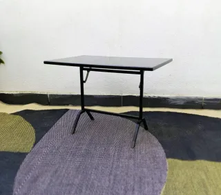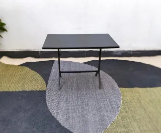 Mesa de centro plegable. Extructura de acero lacado negro con remates de laton en las patas y sobre de madera ebonizada. Medidas: Largo 60cm Ancho 40cm Alto 43cm Con ligero desgaste en la madera y pequeños desperfectos en el lacado de la extructura propios del uso y paso de los años. MESA MID CENTURY AÑOS 50 60 DE AUXILIAR VINTAGE MODERN MIDCENTURY ROCKABILLY STILNOVO HOLLYWOOD REGENCY