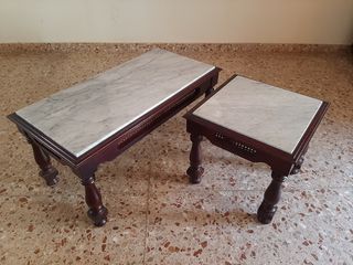 Pareja de mesitas de centro y auxiliar con sobre de mármol y detalles en mimbre. Venta EN PERSONA en La Pobla Llarga, Valencia 46670 (Entre Carcaixent y Xátiva) Rectangular: Ancho 91 Alto 42 Fondo 46 Cuadrada: Ancho 46 Alto 42 Fondo 46