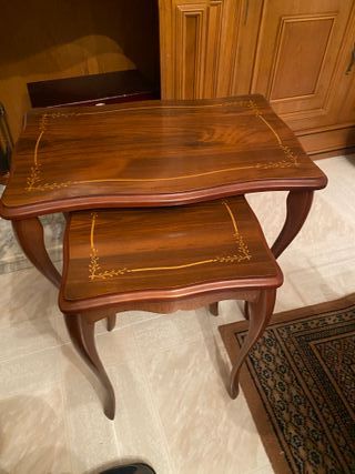 Descripción: > Se vende precioso conjunto de mesas nido (3 piezas) de estilo provenzal/clásico. Las mesas están en perfecto estado de conservación, sin arañazos, manchas ni señales de uso. Detalles: Elegantes patas tipo cabriolé y superficie con delicados detalles de marquetería floral. Material: Madera de alta calidad con un brillo excelente. Funcionalidad: Ideales como mesas auxiliares para el salón; se guardan una debajo de la otra para ahorrar espacio. Estado: Como nuevas. Muy cuidadas. Un toque de distinción y calidez para cualquier rincón de la casa.