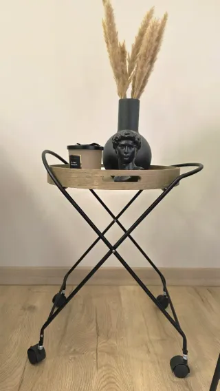 Mesa auxiliar con un diseño inspirado en los años 50, perfecta para añadir un toque retro a tu hogar. Su estructura permite moverla fácilmente. - Bandeja de madera con acabado natural. - Patas de metal negro.
