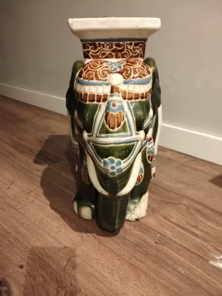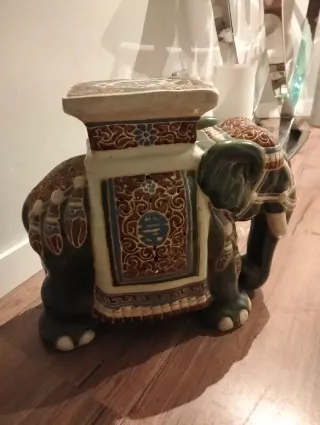 NO ENVIO RECOGIDA DOMICILIO Original mesa auxiliar con forma de elefante, ideal para añadir un toque vintage a tu hogar. Su diseño detallado y sus colores la convierten en una pieza decorativa única. Tiene una pata astillada - Fabricada en cerámica. - Tonos marrones y verdes.