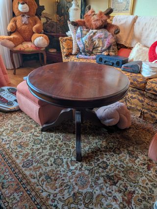Vendo preciosa mesa redonda de madera de estilo clásico. Una pieza robusta y elegante, ideal como mesa de centro, auxiliar o para un rincón acogedor. 🔹Diseño Elegante: Forma circular con un robusto y decorativo pie central tallado y patas curvas muy estables. 🔹Acabado Premium: Madera maciza en tono caoba/nogal rico. Veta vista en la tapa. 🔹Estado y Medidas: Buen estado vintage. Estructura muy firme. ✅Echa un vistazo a mi perfil para encontrar piezas similares 🤝 Trato en mano en Zaragoza. ¡Solo recogida! 😊Dudas? Consúltame.