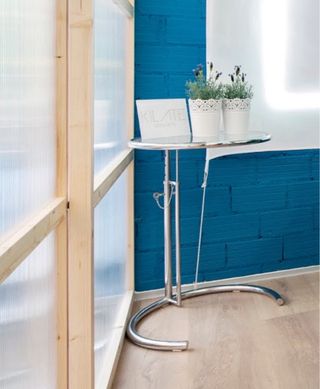 Mesa alta de diseño moderno, perfecta para espacios reducidos o como barra auxiliar. - Estructura de madera clara. - Diseño minimalista y elegante.