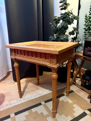 Elegante mesa auxiliar con un diseño clásico y detalles tallados. - Patas torneadas. - Borde superior con relieve. - Detalles florales tallados en los laterales.