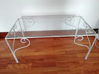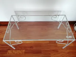 Elegante mesita auxiliar con estructura de forja y tapa de cristal. - Diseño con detalles ornamentales en la forja. - Superficie de cristal transparente.