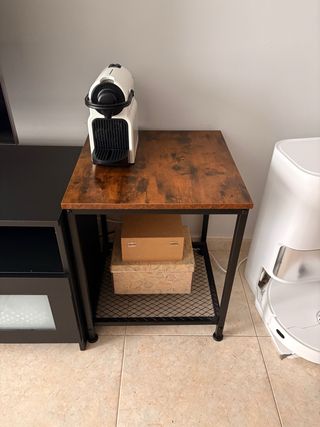 Mesa auxiliar con un diseño moderno y funcional, perfecta para complementar tu espacio. - Acabado en imitación madera oscura. - Estructura metálica negra. - Dos estantes. - Ruedas para fácil movilidad. - Recogida en Carballo (A Coruña).