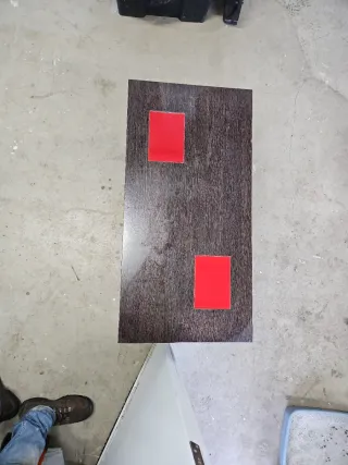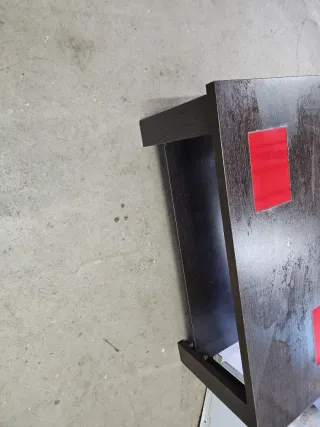 Mesa auxiliar con un diseño moderno y elegante. Ideal para complementar tu sala de estar. - Acabado con veta de madera oscura. - Dos cuadrados decorativos rojos en la superficie.