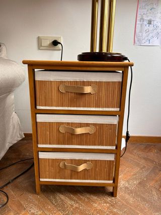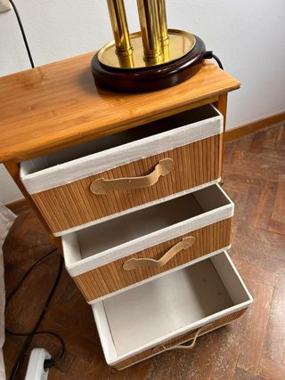Mesita auxiliar de madera con tres cestas de almacenaje. - Estructura de madera de bambú. - Tres cestas de mimbre con interior textil. - Asas de piel sintética en las cestas.