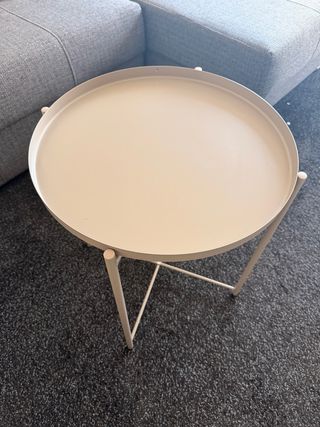 Mesa auxiliar redonda de IKEA, modelo GLADOM. Su diseño moderno y funcional la hace perfecta para cualquier espacio. - Tablero de metal. - Patas metálicas estables. -45x53cm