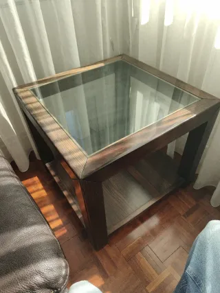 Elegante mesa auxiliar con estructura de madera y tapa de cristal. En perfecto estado, también disponibles la mesa de centro y el mueble de televisión en mi perfil. - Diseño moderno y funcional. - Acabado en tonos marrones y transparente.