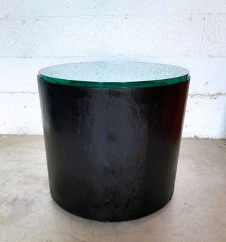Mesas auxiliares de madera negra con tapa de cristal grueso y ruedas para un perfecto desplazamiento cuando sea necesario. Miden 50cm de diámetro y 47,50cm de alto.