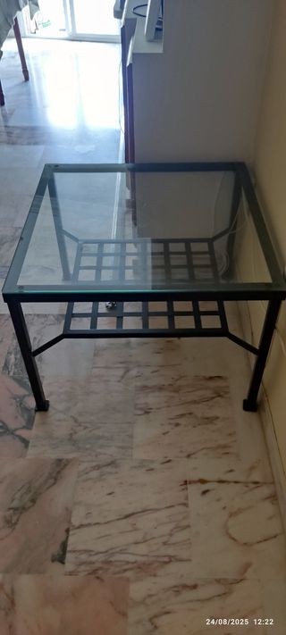 Elegante mesa auxiliar con estructura de forja y tapa de cristal. - Diseño moderno y versátil. - Patas robustas para mayor estabilidad.