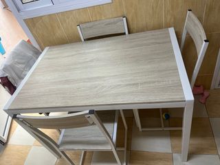 Mesa de cocina con un diseño moderno y funcional. Ideal para espacios pequeños o como mesa auxiliar. - Tablero de madera color haya. - Un cajón extraíble. - Patas de metal plateado. - Dos sillas a juego en perfecto estado al igual que la propia mesa.