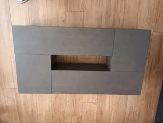 Conjunto de mesa de centro y mesa auxiliar con un diseño moderno. - Acabado en madera con tonos grises y marrones. - Diseño geométrico con hueco central.
