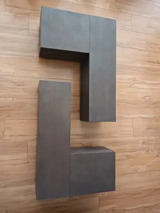 Mesita auxiliar artesanal realizada en madera de Kotibe de unos 75 cm de altura, 48 cm de ancho y 48 cm de profundidad. La tapa que cubre la estructura es de 50 x 50 cm. Recogida en Carabanchel, Madrid