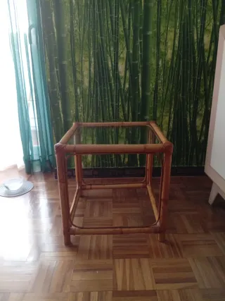 Elegante mesa auxiliar con estructura de bambú y tapa de cristal. - Diseño moderno y ligero. - Ideal como mesa de centro o auxiliar.