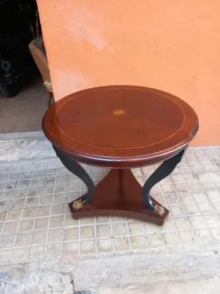 Elegante mesa auxiliar de madera con un diseño clásico y funcional. Perfecta para añadir un toque de estilo a cualquier rincón. - Tablero redondo con borde decorativo. - Base de tres patas curvadas para mayor estabilidad. - Patas con detalles torneados. Le falta la pieza central de marmol