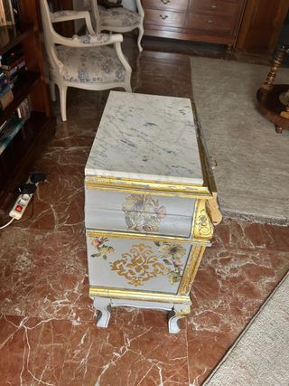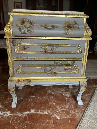 2 Mesas auxiliares de madera con un diseño clásico y elegante. Perfecta para añadir un toque de estilo a cualquier habitación 10€ cada una. - Cuatro cajones con tiradores redondos. - Patas talladas con detalles. - Acabado en tono natural de la madera.